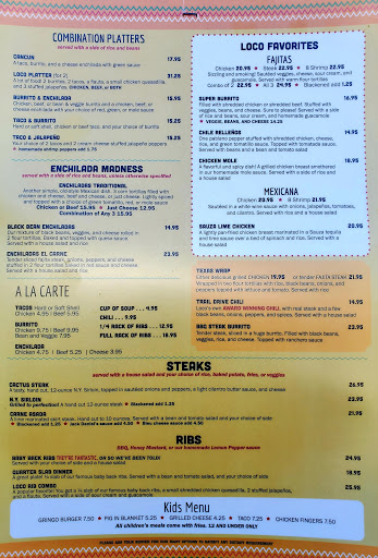 We have been going to Loco for years. Food has alwasy been great and the best margaritas in the area. The atmosphere is warm and freindly, especially during the cold months, with 2 fireplaces going. Best ribs EVER!!!!!