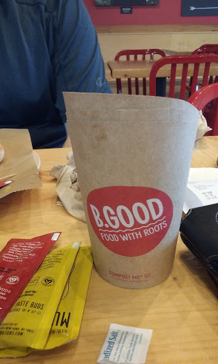 b.good serves locally fresh grown produce, cheeses and meats. Theme is to support your local farmer. The menu features burgers with seasonal ingredients, salads, milkshakes, and fries (potato & sweet potato). The prices are fair which means that you can expect to pay between $10-$15 per person for a drink, burger/salad, and side of fries. They offer a kid’s menu. The thing that I found most unique is with their choices of drink flavors. For example, they make “homemade & all natural” iced tea and lemonade. Flavors include unsweetened lemon iced tea, strawberry lemonade, rosemary lemonade and beet-ginger lemonade. The soft drink machine offer blueberry, raspberry, diet and regular cola made with cane sugar.
