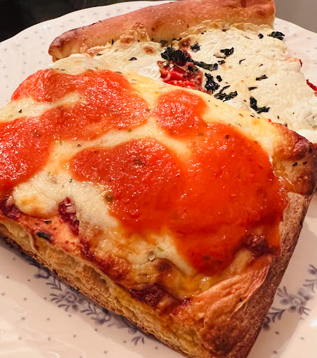 Pizza is pretty good. I like to get roasted peppers on a cheese slice. The Grandma slice is also pretty respectable.