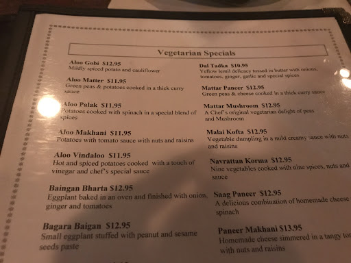 Generally pathetic excuse for Indian food. I did the lunch buffet and for $16 went away feeling like a loser. One fried chicken nugget entree seemed like it was reinvented/reconstituted chicken from Chicken Tikka Masala. Nothing but chicken... No lamb. Spinach was soupy and poor tasting. Eggplant/potato dish was OK. Little to choose from and sparse seasonings and condiments. Meager salad ingredients/fresh, raw vegetables. Food was bland and basic.