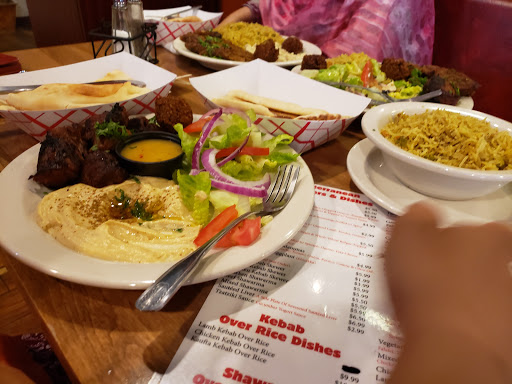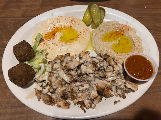 This restaurant is a favorite of mine when I want quality fast food with an ethnic flair. I havent tried the non-middle eastern foods (I can recommend better pub-fare places nearby) but the pizza is top-notch NY thin crust. The three stand-out items are the Chicken Shawarma, Falafel and Hummus, I dream about these at night. The chicken is cooking on a spit that you cant miss walking in, and their homemade hummus is addictive and blows away anything I can find in a store (eat it Sabra). For a unique combination, get a cheese pizza and spread their hummus on each slice as you go.
