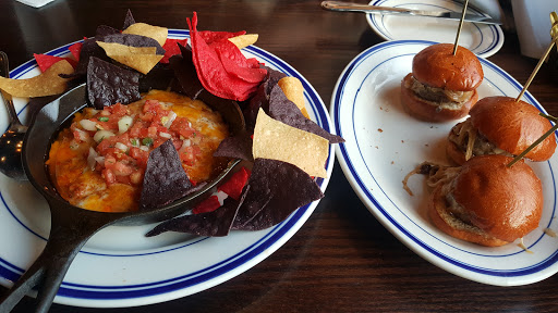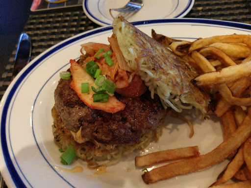 Pretty popular spot on Mothers Day. Sat ourselves promotly in the bar area, and the service was decent. The smoked wings with the pastrami dry rub were great and so was the giant pretzel. The cheese dip for the pretzel tasted like the cracker snack packs youd have as a kid, and thus familiar and actually went well with the pretzel. The bison burger I had was decent, but the construction of the burger was just all off.. the sauce served with it was put on the bottom bun instead of the top of the burger so it just soaked in and could even taste it, and the top of the burger had crunchy fried onions and then somehow had on top of them two sliced tomatoes and then lettuce on top of that.. The meat quality and cooking was on point, just seems they dont really know how to properly combine the flavors.. I should have been tipped off by the mural on the main wall which shows a deconstruction of a burger but the cheese is below the burger and between the veggies?.. whomever created that diagram should be shot.. otherwise meal was good and guess what?.. Found out after the meal that Moms meal was free on Mothers day.. which was a nice surprise but a little annoying we werent informed of that at the beginning of the meal.. Basically they need to tighten up their shop and the ratings would all be higher.