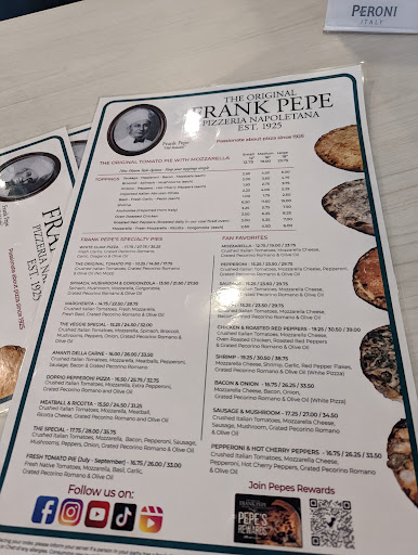 I live in NY, as you know Most pizza is compared to, but i have to say what i have at least twice a month is Frank pepe pizza. Words cant explain the quality, if you are from NY ask for a NY cut they dont seem to mind. And by the service cant be Beat . I highly recommend Frank Pepe pizzeria absolutely a most have.