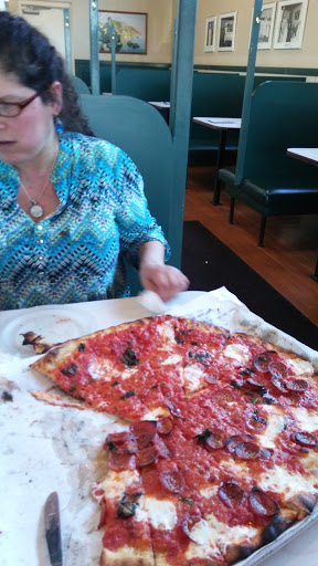 Love this thin crust New Haven style pizza!!! Not sure if its coal-fire or wood-fire ovens, but something just makes this crust 1 of the best thin-crusts ever. The red sauce is delicious and any toppings Ive gotten (sausage, pepper, onion for the most part) are great. They have a summer special from Jul - Aug which is def worth checking out. Atmosphere is nice... bright and covered with some nice old photos, you can see the kitchen/ovens when you walk in... Ive been told this pizza is not as good as the location in New Haven, but I cant imagine this pizza being much better than it already is... Great pizza spot!!