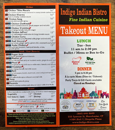 I visit or order from IndiGo almost every week! I think IndiGo is the best Indian Restaurant in the area. Their use of spices and herbs are most authentic and really make their different sauces outstanding with distinct flavors. I love their great variety of vegetarian dishes, I especially like their garlic naan, mulligatawny soup and palak paneer. My husband, who is a meat eater, loves their tandoori chicken and shrimp kashmiri khorma. We love so their food so much that we ordered catering service from them for our New Year family gathering. They served with professionalism and the food are real hot when they delivered to us. The Chef/boss Sheen is the most friendly person and will work on the menu with you. I will definitely order from them again!