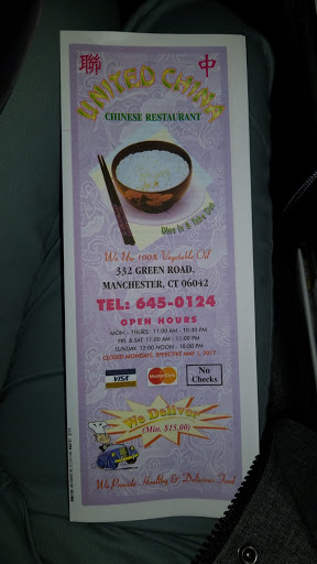 Hands down the best Chinese food in Manchester... excellent crab rangoon, boneless spare ribs, sweet and sour soup, and General Tsaos chicken, to mention a few. Fast, friendly, and priced right, if you havent tried United China yet please take my word for it, you wont be disappointed.