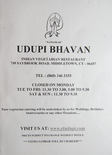 Belive me The owner of the restaurent is absoulte greedy fellow ....He is only after money ...He just makes average food and acts as if he is making great service to the Indian socoety ...His South indian Sambar and chutney is wost on the earth ..Its best example how to make worst chutney and sambar ... He says special Dosa and ask whats the special he says chilly added to it ..he charges extra $2 for it ..If you want to rate it its probably worst Vegetearin restaurent in Connecticut ..if you want to enjoy Good Indian food I recommend PRIYA at rocky hill or THE AMBASSADOR at Glostnebury ...Please dont visit Udupi Bhavan its worst place ..owner of the restaurent is only for money ad not for better service