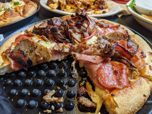 Decent seating and interesting atmosphere, and I thought the prices would have been higher. But the pizza wasnt too great. Nothing tasted terrible, but I didnt taste much of anything with some bites. The crust was always spongie and tastleless, and there wasnt much taste from the cheese either. Toppings were good, but how do you have bad-tasting pepperoni? Even the soda tasted like flavored seltzer more than coke or root beer. So, the menu is good, they price well, and you can find seating. Just dont expect to be blown away by the pizza.