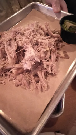 Wonderful barbecue. Very small potions which I do admit hit the spot. Just think of barbeque, piled high . Okay so I had the brisket and my other party had pork belly and shoulder. Which is one belly and on strip of shoulder, we shared the mac and cheese, which was awesome smokey cheese goodness. Also they have fried green tomato on a sandwich, which I asked to sample and also gave a little advice . Serve fried green tomatoes as a side.The tomato also was very delcious. Ill be back guys , to try the grits and fish. Wish a sandwich h was really a deep south sandwich. (Pile on the beef,Ill pay.)