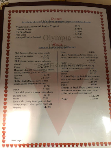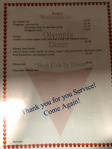 Olympia Dinner the food is sooooooo good ; the service is excellent. The staff is excellent, very friendly and you feel right at home; even the customers are friendly to each other. I love Olympia Dinner.