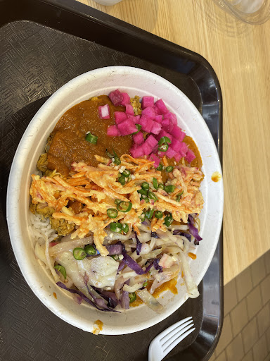 I dont understand what kind of business model Tikkaway Grill is operating with, but I approve. Are they somehow making money by giving me a giant pile of delicious Indian food for 7 bucks? And I can choose pretty much anything (and everything)? Ive only had the rice bowl, but it is a truly impressive amount of food. They let you combine whatever ingredients you want and create a true abomination that would make the Gods shake their heads in horror. And they dont skimp on the food, either. This is the kind of meal where if you threw it at someones head, they could be seriously injured (a solid plus in my book). I think the guy behind the counter was pretty amused that I legitimately wanted a bit of everything. Im not smart enough to know which diced red stuff goes with onions or cilantro or what. Just throw it all on there, buddy. Its all gonna look pretty similar in my stomach anyway. The flavors themselves were a nice combination and the spice was perfect (I got the medium-spiced (madras sauce). It burned, but not in the way Id spend the next 12 hours regretting. However, the small space isnt very conducive to forming a proper line/queue and its a bit tight in there. If youre British, you may find it horrifying. But it wasnt too bad. Service is fast and friendly. They even give you two sauces with a fairly affordable samosa (1.25!). Which you can then dump on your feast! The only other flaw is their hours: Open until 9pm during the week (yay) but only 7pm on weekends (boo). Id think at the least they could stay open until 9 or even 10 on the weekends. Id love to be able to stop by between bars and scarf a giant bowl of Indian food. You know youre doing something wrong when the only flaw is, "Why cant I jam your food into my head more often?!" Well done, Tikkaway. I dont know if you invented the "like Chipotle but for Indian" thing, but if you didnt, you sure as hell brought it to the next level.