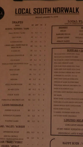 I have visited Local many times and have always loved it. My feelings have changed since my most recent visit Sunday night 12/6. I work at a restaurant in Norwalk and wanted to enjoy a few drinks and food after a long day at work. My co-worker and only stayed for one drink due to the terrible service we received at the bar. The bartender was rude, drunk and acted as if serving us was a burden. He was more focused on gossiping with the manager and staff. Being in the business its nice sometimes to go out and be waited on...We deal with drunks everyday when were behind the bar we shouldnt have to when were on the other side. I love the food and beer selection at Local and am upset to have had such a bad experience