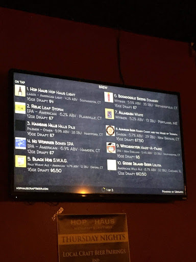 Hop Haus is a Plantsville/Southington Gem. The previous bar (Quinns) was nothing to write home about, in fact if my memory serves me right the place was downright dirty. So in comes Hop Haus, with a fresh clean look, and a craft-beer focus that was right up my ally. My first visit was great, i drooled at the sheer amount of taps they had (close to 30 I believe, and not a bud light in sight!!!). Now I have returned countless times to try new brews and meet old friends. I have enjoyed a ton of food here as well, the poutine is great particularly with a flight of beers. Recently I had a going-away party here, the staff were wonderful, taking my reservation of the whole VIP section at no additional charge. We enjoyed a private party area with waitresses tending the whole night, bringing food and drink to all my friends (which must have been no small feat!). The party was a hit, and I am happy I had it at the Hop Haus.