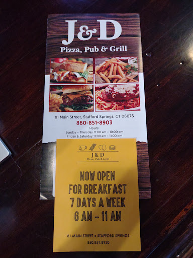 Ordered a couple of pizzas. Made to perfection. Good food good price, love eating there. My wife and I use to travel to Windsor locks for good pizza. J&D is every bit as good, closer. And muçh cheaper. We love J&D.