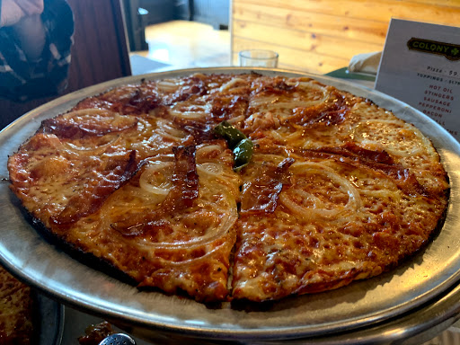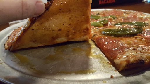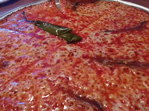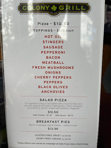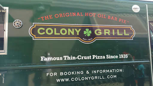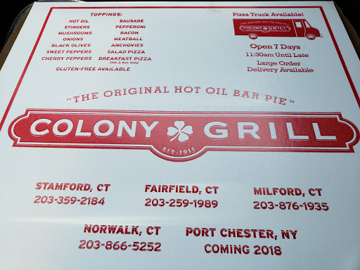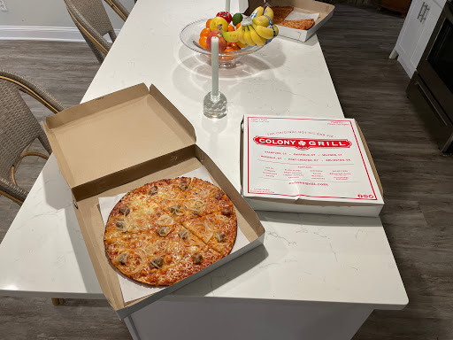Talk about thin, crispy crust. This joint has perfected it. Colony Grill is situated in what looks like a very run-down area of Stamford. The surroundings are very "industrial", pock marked with wide swaths of parking lot areas - at least thats my impression. Inside, its your usual pub atmosphere, with diner booths, long Irish style bar, dark woods and low lighting. I sat down at the bar, got me a Stella and ordered a pie with hot oil. Colonys pizza looks a little odd because it doesnt have the border of crust that Im so accustomed to seeing in a traditional pie. The contents literally bubbles on top, almost flirting with the danger of being completely burnt and ruined. Ive written other pizza reviews where I have described the pies to have a sturdy crust effectively holding all the toppings in place, but this one really gets it right. The crust is sheet thin, truly sturdy and crunchy, yet still light at the same time. As you get to the edge, that noticeable crunchiness is such a satisfying texture. There are no problems with this pizza except my preference has always been for more pliant crust. Also, the cheese and sauce on top of Colonys slice, while satisfying in texture and taste, is not outstanding. Because its so overcooked, when the cheese cools a bit, it gets very tough. Without the sauce underneath providing a layer of moisture, the cheese could have easily turned into a frico. But really, Im splitting hairs here. The pizza here is very good; Im just trying to justify why I like my NYC pizza a little more. Otherwise, Colony does it right. Its just a slightly different execution, and therefore comes down to a matter of preference. Other considerations: Service was good and friendly.