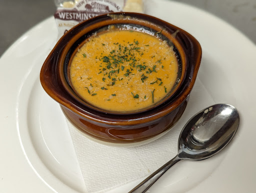 What a find!! My husband and I stopped in for early lunch. I started with a lobster bisque that was buttery and flavorful with a large chunk of real Lister floating in the middle. Then moved to the steak, cheese, mushroom, pepper and onion sandwich. Tender flavorful lean steak was excellent. Handmade truffle fries accompany the sandwich and again the flavor was unreal. Finished with one of the best, fresh cups of coffee. Wait staff very personable and attentive. So glad we stopped.