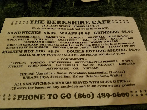 My favorite pizza in the Torrington, Winsted, Litchfield area! Its consistently delicious. We love the sausage and roasted pepper toppings. The crust is not thin, and its not deep dish. Its medium thickness, just right. Generous amount of sauce, cheese and toppings. This is classic old fashioned pizza. Weve never been disappointed. Lots of atmosphere, this is a charming old western-style place, divided in the middle with a high railing. There is a bar on one side, and tables and booths on the other. Dark wood paneling and tall booths, a vintage tin ceiling, and old photos of Torrington make Berkshire a comfortable casual place to bring friends. Each booth has a sconce on the wall for soft lighting. Friendly service. Berkshire doesnt accept credit cards. But if you are short of cash, they have an ATM.