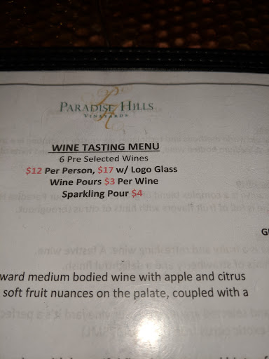 I have been here many times with my family and friends. It is always a wonderful experience. The wines are excellent and the staff is very friendly. Paradise Hills is always my go to vineyard when looking to relax and enjoy a glass of wine with family and friends.