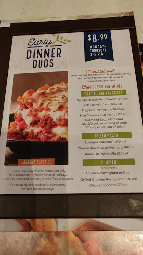 Looking at the parking lot when we frist arrived we thought this place is going to have a long wait if so we were leaving. But we gave it a try . But they have more seating than we thought ,because we were taken right in. Ordered right away and the food came right away. Then though as we were seated we walking by a table of 30 it looked like and I thought for sure that would be holding the orders up. But no . All orders same to be coming out fast and perfect. I have to give it to management this olive garden is run really well. And the food was excellent. The waitress was excellent. Very happy with everything. Ive been to alot of olive gardens in Florida, NC,CT,NY,you get the picture. Some were great and some not so much. But this one is excellent and well run. You all have to try it. Thumbs up
