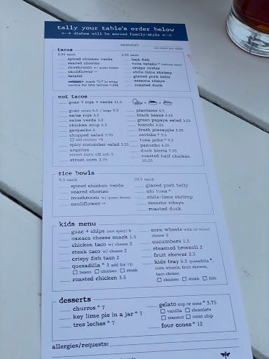 Family style ordering was a little strange, we were a large group and had a lot of trouble figuring out which taco was what. Really great pork belly taco, you can get it as a lettuce wrap too. Drinks were good!