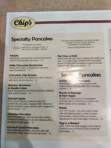 Iffy meals. I ordered the steak and cheese omlette, which comes with three buttermilk pancakes. I requested to hold the cheese (Im slightly lactose intolerant) and was still charged full price. The pancakes tasted like they put all their salt into those, and focused on pancakes. The omlette was under salted, but fairly filled with the ingredients. What irked me was they put a nice, large pancake on top, and the bottom two were significantly smaller. To the point I felt like I was actually getting two pancakes instead of three. I dont recommend coming here after 9:30 am, it gets crowded with a line, and the service obviously suffers. We arrived earlier, about 6 am, and noticed a significant difference. Sure, the waitress was friendly and helpful, but not really on the ball for coffee refills. If you have children or just want to eat breakfast, Chips isnt terrible. It has very sweet pancakes, albeit oversalted. If youre trying to enjoy a nice Sunday morning breakfast, between two adults? Eh. Their coffee was 2.19 with unlimited refills, steak and cheese omlette is 12.59. Fairly high priced for the quality. I would consider myself an experienced customer due to having come here multiple times. (My daughter loves their breakfasts. Like I said, good for kids with a sweet tooth. Just dont do it too often.)