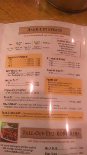 I have never had a bad steak here, and Im picky. Theyre always nicely seasoned, and, even more importantly, beautifully cooked. The drinks are big, the sides and appetizers are yummy, the service is friendly, and altogether those things make up for the fact that the atmosphere is rather noisy and kitschy. If youre craving a good steak in Dover, stay away from that other big chain on the north side of town. Texas Roadhouse is your place!