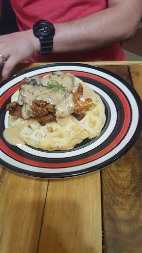 Eclectic menu items with humorous descriptions. Definitely worth the trip if in Dover. I have gone twice and I will definitely go back to try different menu items that looked appealing (chicken & waffles). I ordered the apple cinnamon pound cake french toast , it is more dessert than breakfast. Not four stars because my eggs were undercooked even after they offered to fix. My companion didnt seem to care for the presentation of his dish, but he still ate ALL of it.