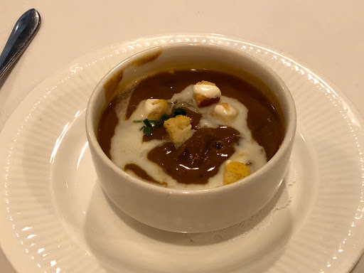My wife and friend like the pumpkin soup but thout it wasnt as good as remembered. I thought it was too sweet. My wife wanted to exchange the squash with potatoes or aspagas that came with the crab caked but was refused any changes what-so-ever. She switched to the twin 4 oz. filets which were ordered medium rare and came medium. I ordered the 7 oz. filet with mushrooms all in a pastry crust. I ordered medium rare and it was served well, dry and flakey. We will not return and I wouldnt recommend it again.