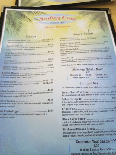 Whether you want crabs or crab legs, this is the place. I am a Marylander who grew up on crabs, but the Surfing Crab is hands down the best place on this half of DE. The quality of the crabs and legs are priced fairly good compared to any place around the Sussex Cty area. I made my first trip to Lazy Susans after reading the reviews. I have to say, I wasnt impressed at all. Crabs and legs have to be cooked just right as well as shrimp, and sorry DE, but most of you dont have it mastered. When folks are paying a decent penny, dont let them down, the owner takes the beating, loses customers, and no one wants to leave a good tip for food that isnt cooked properly. So dont let them down either. Surfing Crab, hands down you are the best. I sincerely hope you keep your standards high. All of our out of town company loves coming there each and every time they visit. We usually have the same female waitress, who has always been great. The one fella does need a little work on waitering. Customers dont want you down their back, but they do like to see you occasionally for refills and and stuff.