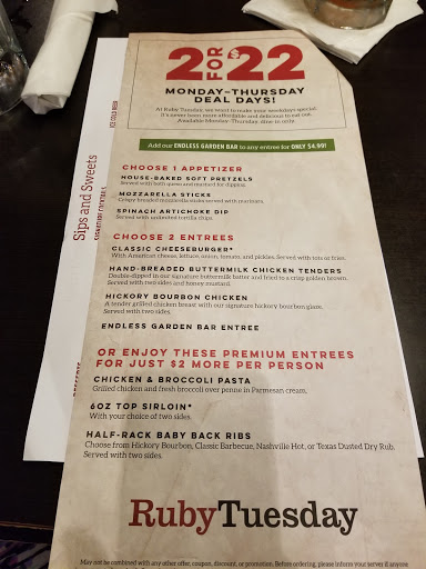 The nice thing about this Ruby Tuesday is that it is consistent. The food is always cooked the way we want and wide selection for a chain restaurant. Extremely large and stocked salad bar for minimal additional money. Wait staff is always pleasant.