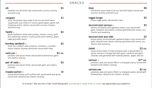 The people who work here have been so nice and welcoming! Answering any questions and pleased by my excitement of their wonderfully flavored food! Have been looking for a place with lovely spiced Indian cuisine and I have found it! Their vada, dosa, and Bahji are delightful! Please bring this lovely pace some business
