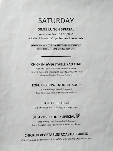 In May 2014, In Rehobeth Beach, we left our hotel in search of Asian food, and happened upon Lily Thai Cuisine. And what a find it was. Perfect for the four of us in every respect. Clean, comfortable, quick service, wide menu, good prices. And the quality of the Thai cuisine was as good as any Thai restaurant that weve been to on the WEST Coast. Recommended without reservation.
