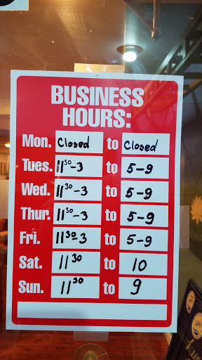 | Working: | Closed 11:30AM–9PM 11:30AM–9PM 11:30AM–9PM 11:30AM–9PM 11:30AM–10PM 11:30AM–9PM |