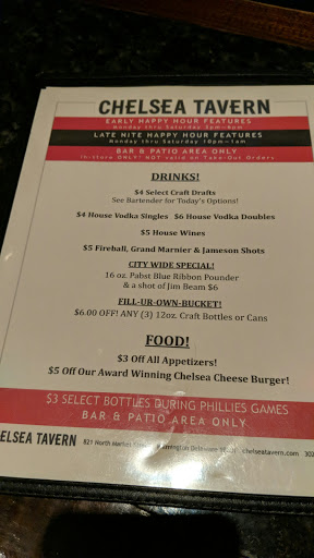 My wife and I went to Chelsea Tavern for dinner. Our waiter helped me find a beer that I enjoyed very much off of their extensive beer list, and my wife chose a wine that she also enjoyed. The appetizers were fresh and delicious and were the main dishes. We had the flat iron steak with potatoes and grilled asparagus.