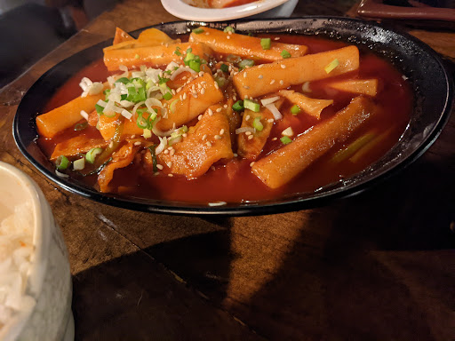 Went there early on a Sunday night, and the place was quiet (just a handful of other patrons) and service was nice & unobtrusive. They didnt have any signage on the outside of the restaurant, which was confusing, but the inside is quite gorgeous. Food was yummy, and definitely not Americanized...if youve never had Korean food, prepare for a unique new flavor experience. Got the Dukbokki (not too spicy) and Seafood Pancake (really crispy delicious dough, but I wasnt a huge fan of the octopus tentacles...my friend loved it though!). Also, do yourself a favor and get the yuzu tea - slightly sweet and fruity/lemony. Delicious.