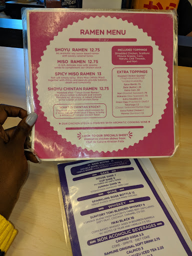 If Saved by the Bells The Max was in Tokyo, this would be it. Just around the corner from its mother, Daikaya (a popular DC pork based ramen shop), in Chinatown, this funky taken shop has a quirky school cafeteria/cafe feel to it with its 1970s booths and blue school cafeteria trays decorating the walls. If the back bar and booths are all full, youll be seated at one of the two long tables with complete strangers (a trend I hope more restaurants in the USA adopt). Youll sit side by side your dinner date as you browse their simple menu. This place only serves chicken based ramen but they do have a few veggie options too! They have three chicken ramen ranging from a lighter broth (shio trio) to more heavy (miso). I ordered the shio trio with an egg and corn. It was very tasty and the egg was the BEST egg Ive ever had (it tasted like candy). We also ordered chicken dumplings (youll get four dumplings). They were tasty too! The icing on my cake (or should I say ramen) was the Royal Milk Tea. I used to buy these in China for a few cents and even though Bantam King charged me $3.50 for it, it was worth it! Its sweetened, cold milk tea and its amazing! All in all, we had a great experience. There was no wait on a Sunday night, service was excellent, food was tasty, and the funky atmosphere is on point!