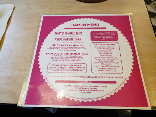 Will NEVER return! I could have purchased a $0.25 package of ramen and it would have been better. The broth was not developed, the chicken was not seasoned, which would have happen if the broth was developed, and the little bitter green things with stems made it even worse. Then I asked for chili oil and was told to use the ground pepper on the table; however, they sale dumplings with chili oil so not really sure why i could not receive a side of it. Once again not a well developed broth so i asked for salt and the cook looked offended, LOL!!! just sad and really needs help. the waiter was very polite and informed us that the business has only been open for a few months and working through some things. Im guessing the things will include not having repeat customers. final thought! EVERY ramen should have chili oil on the table and offer offer a spicy miso