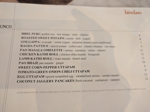 Despite high expectations set by being regular patrons at Rasika and Bombay Club, Bindass failed to make the cut largely due to its poor customer service. The owner Mr. Bajaj was extremely rude and not willing to accommodate to reasonable requests. The atmosphere maybe chic and menu innovative, but the bitter response to once loyal clients cannot be swallowed!