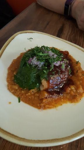 The decor and service were both excellent. The appetizers that we got (ragda pattice, avocado golgappa, and shisito pepper pakoda) were all great tasting, but very small given the price. I would say that the best of the lot was the ragda pattice. The pao bhaji was my entree; it was excellent, but you might want to order an extra set of pao (bread) to go with the bhaji. I also tried the spinach and paneer khati roll (not on the menu, but available for vegetarians); it was solid, but not quite as good as the pao bhaji.