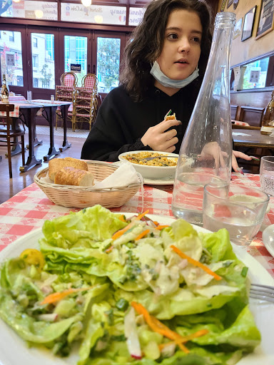 Good food, a very friendly and fun environment all made this French meal a good experience! It wasnt like Disneys "Be Our Guest" (a French dinner which I am still hoping to experience once in my life), but I left wanting to try more French food! I went with a group of friends and although the place was packed, we got seated in less than ten minutes. After ordering and waiting for food, our waitress gave my friends and I a quarter so we could play foosball. Its little things like this that make life better :] we only played for a short amount of time however, as the food came out pretty fast. While my friends ordered salad and French fries (really?!?) I ordered the Mergez grillées, taboulé version Bistrot. It was spicy sausage in a French stew with couscous and steamed vegetables. The meat was delicious. The vegetables were cooked perfectly and had amazing texture. I got pretty full quickly and had to take leftovers home, I think the first time I have done that in DC. I dont think it was worth $20, but it was good to try. This place has a variety of items on the menu but dont take friends here if they arent very open-minded about food. Expensive, but good service and a fun French environment made this a pretty good dinner.