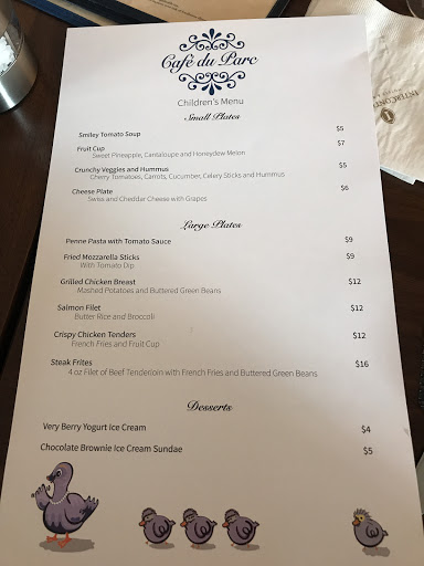 My family took me to Cafe du Parc to celebrate my birthday. I was blown away by the excellent service we received! They had decorated a table for the occasion, and the restaurant even gave me a birthday card signed by the staff. I was a little disappointed they didnt have a steak frites entree with filet mignon (only with NY strip, which I dont particularly like) but I just ordered the filet and our table split a few orders of fries. The food was good, but the exceptional service is what really stood out.