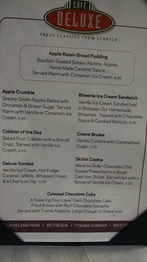 Cafe Delux is a wonderful restaurant that I love visiting. The Restaurant is nice and bright and has indoor and outdoor seating. The carpeting helps keep the noise down as well. All orders are served with bread, butter, and water and the food itself is delectable. My personal favorite is the seafood pasta. As for dessert, I have loved the apple crumble with vanilla ice cream for years. It is the perfect balance between cold and hot. I also love the sundae which I tried recently. The toppings including hot fudge are what make this dessert so wonderful. The location is also great as there is much parking close by and it is near the National Cathedral and the Washington Ballet Studio.