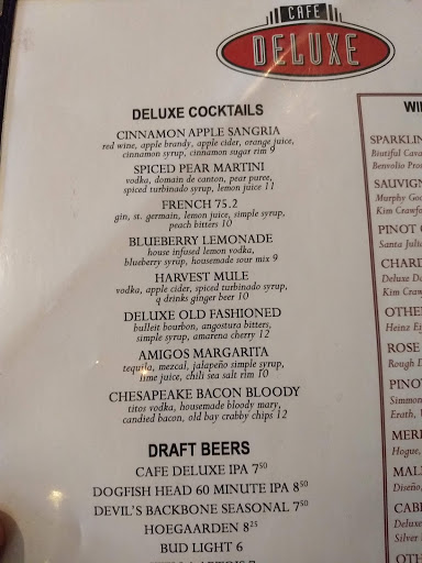 I used to come to Cafe Deluxe ALL the time after I got out of high school and I LOVED this place.....would come all the way from Germantown to have their out of this world Chocolate Martini. Well I OF COURSE ordered my usual....after I spent five minutes bragging to my DC friends about how amazing their Chocolate Martinis were I waited for mine....it was TERRIBLE no cocoa on the rim no chips in the bottom and the it was weak and yucky. The food was pretty decent except for the gaspacho soup which for some reason I couldnt get my waitress to get me a spoon?? To top it off my boyfriend who I bragged up the place to got food POISONING from the crab cakes. HE threw up for TWO days....and hes still feeling quesy when we went out to eat for dinner last night. I will NEVER eat here again!!!!!!