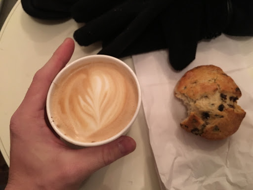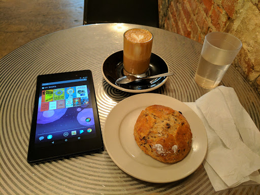 Borderline between 3 and 4. Nice brick-and-steel, long and thin space. Password-free wifi. Lots of small tables for working. Ive been here a few times and its usually full or near full. Oversweet hot chocolate. Sandwiches and pastries in theory, but all were gone when I was last there (530pm on a Thursday). Lots of biscotti and dark chocolate bars. Reasonable selection of teas.