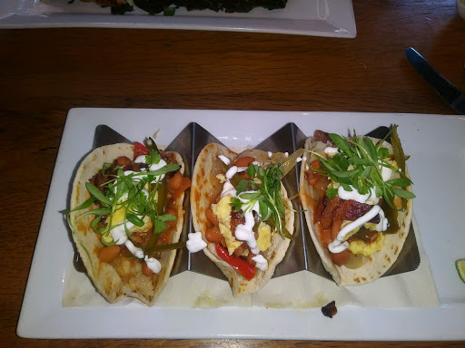 Found this place on Google because I wanted a spirited beverage. We arrived at 3:30 in the afternoon. Once inside, the bartender informed me that because their transitional period between brunch and dinner was from three to five, their menu items were limited ... Indeed. Only fourteen things to choose from ranging from appetizers to various sandwiches. I pondered leaving because I was hungry but decided to stick around and try it out. Boy, was that a great decision. I had my cider, of course, but the food items I ordered were amazing! The wings, well seasoned and just delicious. The ham and cheese was not traditional, But it was super! And my friend comments that the Caesar salad he ordered was plentiful, flavorful and the portion sizes were pleasing. Overall, I felt the place was above and beyond what I expected. The atmosphere was "energized melodrama" ... playful yet calming.