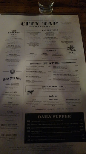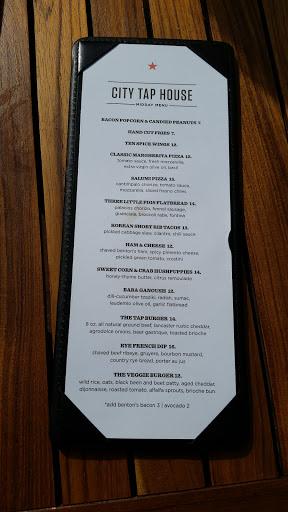 Having lived 2 blocks from City Tap House for almost a year, my husband and I found every excuse to save it to check it out "some other time". "Long weekend? Lets go somewhere FARRR. They have gazillion beers on tap? Lets wait to take friends who would appreciate the selection!" Not until we finally did have friends in town and I was held back by hospital calls (boo to not going anywhere far), we stopped by to check out their brunch menu. There were a handful of items I wanted to try! Their famous Blue crab mac and cheese wasnt offered on brunch menu but the waitress graciously offered to ask the kitchen to make it for us. Ultimately however the four of us opted for individual entrees - ricotta pancakes, blue crab craftwich with sweet potato fries, chicken and waffles, and salmon hash. After reviewing yelp pictures, I was surprised by the size of the entrees - they were at least twice the size I expected them to be. Perhaps the huge plate/bowl just made the portion appeared much smaller? Ricotta pancakes - fluffy and perfectly sweetened. Still doesnt beat NYCs Almonds lemon ricotta pancakes but these were pretty good. Bluecrab openface craftwich - juicy lumps of crab meat+ melted Havarti cheese + handful of flavorful sun dried tomato + fresh avocado slices on toasty sourdough = the perfect bite. I especially loved the honey mustard aioli pairing. Gotta pat myself on the back for the swap of their perfectly crisped and non-greasy sweet potato fries! Chicken and waffles - beautiful presentation! Savory bacon bits and sweet pepper jam to go along with crispy yet juicy fried chicken = so yummy! However, I was underwhelmed by the soggy, tasteless waffles. Thank goodness for maple syrup to save the day! Salmon hash - generous serving of grilled, flaky salmon + two beautifully poached eggs over almost what appeared to be "bottomless" potato hash. This dish was much heavier than expected. They were a bit heavy handed in the amount of oil used in making the hash. And the amount of potato... would def recommend it as a "hangover" cure - nevertheless, a good but not memorable dish. Overall - I was impressed by the quality and the quantity of the food offered here in City Tap! Definitely exceeded my expectation of a gastropub! Service was attentive, price was fair. With just walking distance away, my husband and I look forward to returning to check out their dinner/happy hours/late night grub menu!