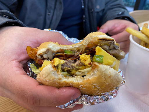 A quiet location and an understated interior make this a great place to sit down and chill. We all got burgers; they have a great array of toppings and the burgers are stain-the-bag greasy good. We also ordered the large fries, which are like boardwalk fries, and there were so many fries spilled over in the bag that we could fill 3 cups. A large fry will probably feed 3-4 people if you are all getting burgers. We definitely recommend this place if you are looking for something simple!
