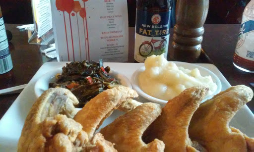 Been to this place twice... the first and the last. A friend purchased a Groupon for us get some Soul food for Sunday dinner. Exciting right? Nope. Its been a long time since Ive had such awful food and service. Got there at 4:40 p.m. on a Sunday and shouldve known something wasnt right because the place was empty. We were seated upstairs with blaring jazz music. Our waitress was pleasant enough (with her visible crack)- though we felt like we were getting on her last set of nerves. She gave us our wine and took our appetizer order. The jerk wings were ok but the fried wings were DELICIOUS. Thats what the star is for. Ordered the fat fries and they were nothing to write home about. I ordered the southern fried chicken and waffle with garlic mashed potatoes and collard greens. Chicken was wonderful but the mashed potatoes were too garlicky, the waffle felt like a piece of cardboard and the collard greens tasted like a green leather collar. Also, we didnt get our food til minutes to 7:00 p.m. Certainly will never visit this "establishment" ever again!!
