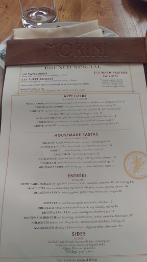 To be honest, we ended up at Morini because no one else in the area had space. Im so glad we ended up here, though, as the meal was a real treat. We started with the trout spread, which came with warm, slightly chewy crostinis. Im not one for crostinis, generally, but these were delicious in their chewiness and warmth, and worked well with the spread. The portioning felt fine for $5. We also shared a plate that had two cheese and one pâté. None were particularly thrilling, but all were quite good. The serving size of the cheeses felt disappointing for the price, but I suppose thats what happens with a cheese plate at a fancy restaurant. The serving size of the pâté was fine. We were also offered bread, and it was warm and rosemary-filled. Yum! For the meal, I ordered the gnocchi. I was surprised to see it arrive with ham laced in, and the waitress told me that the menu had stated ham would be present (the word "speck" was listed, and I hadnt known what speck was), but was nice about taking it back and getting me one I could eat. And I was SO happy she did because that dish, my goodness, I could eat that every day and still not be eating it often enough. Its ricotta gnocchi, with a balance of fullness and delicateness, and it was all in this dreamy balsamic sauce with the crunch of diagonally-sliced snap peas. I kept going "mmm," which must have been incredibly annoying to all around me. We didnt taste any of the desserts or drinks, but the dessert descriptions were very tempting. The bill came to about $40pp (including tax and tip). A nice meal out, and nice it was! Id happily recommend this place to others.