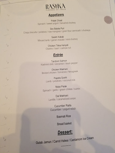 This restaurant was a disappointment on several levels. The hallmark of an upscale restaurant is that they treat you like a VIP from the moment you come in and do their best to provide a whole pleasant meal experience. We ordered for our lunch the chefs tasting menu, which is a multi-course choice somewhat large for lunch, and just a starter for my wife, with the idea to share the food. Well, the waiter balked at that and said he had to ask if the manager would allow us to share our food. This was not an all-you-can-eat buffet, where sharing is obviously a form of cheating; this was a fixed amount of food Id pay for and with which I should be able to do almost anything I please. It had a chilling effect on any enthusiasm we may have had to try this new restaurant, and things did not get less awkward when the waiter informed us that permission to share our food had been granted. I felt a rude retort wanting out, but I kept my cool. This was going to be a $100 lunch for two, and there was not a trace of VIP feeling. In lesser restaurants we often get, bread and garlic oil, salsa and chips, or olives, on arrival, to bridge the wait for the first course, but here not even a measly poppodum was in sight. Service was slow for a non-peak time and when the food arrived some of it was excellent, some of it was not. Their crisp spinach and mango shrimp are really good, but the rest was below par, especially the typically Indian dishes like butter chicken and other meats and vegetables with a thick, rich sauce. We were told they serve American Indian cuisine, but to me it was just Frenchified Indian. Not a good mixture. Original Indian sauces are rich enough, these were even richer and saltier. Too salty, in fact, and I love salt in my food. What I like about Indian sauces is that they blend lots of spices to a delicious balanced mix where the spices work as a team and no particular one dominates. Not here, the hyper-rich sauces had an obviously dominant spice, be it cardamon or clove, which lacked the beautiful balance I appreciate. The Naan bread was burnt on one side. In the end the manager came to talk to us, and mentioned that the no sharing rule was the owners idea, and gave the reasons, which seemed to apply to large parties, but not to the two of us. I asked the manager to remind the owner that with those prices, one expects the restaurateur to go out of his way to make the customer happy while under his roof, and to make the customer feel cheap with their absurd no-sharing rule was far from it. At least he apologized and took the starter off the bill, which is the reason why I give the restaurant two stars. I dont believe this new branch of Indian cuisine will supersede the traditional one any time soon, and it is a fact that I can get better Indian food and more pleasant meal experience at half the price, at any of a long list of places in and around DC, Mantra, in Falls Church comes to mind, to which I shall be returning. I shall not visit Rasika again.